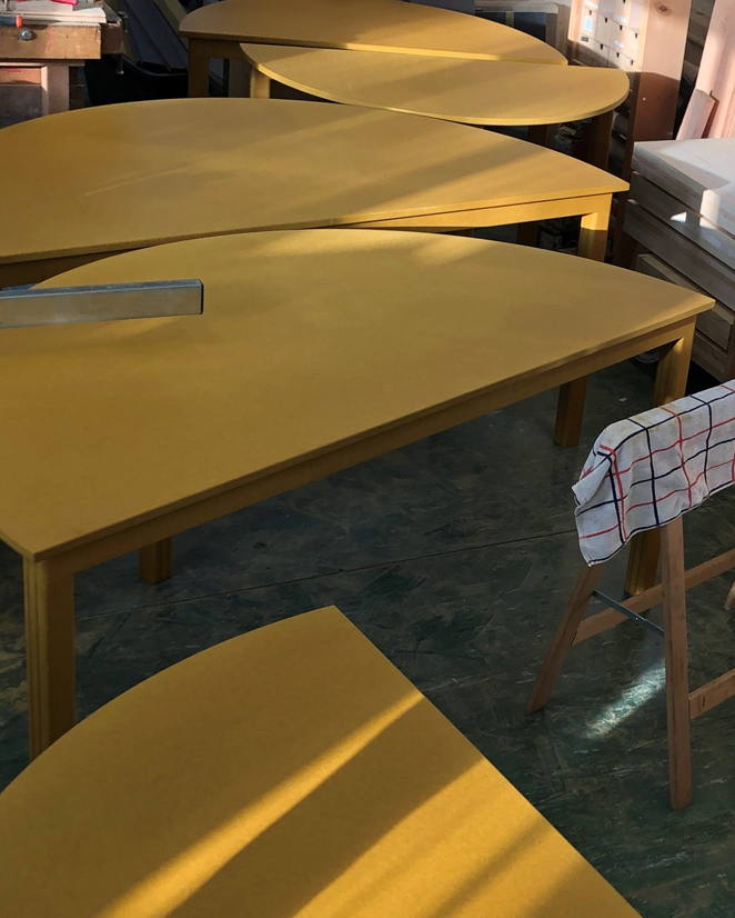 Les objets spécifiques sont en panneaux de MDF teinté dans la masse et se laissent combiner à souhait. Ils proposent aux visiteur.euses une diversité d’usages, leur offrant la liberté de s’asseoir à une table, de s’installer sur une banquette ou de se rassembler debout autour d’un comptoir.